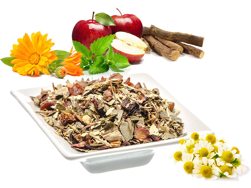 Brennnesselblätter, Erdbeerblätter, Hagebuttenschalen, Herbstheide, Hibiskusblüten, Löwenzahn, Gemeine Schafgarbe, Gewöhnliche Robinie, Ringelblumenblüten, Feldmohn. Verpackung: 100g.