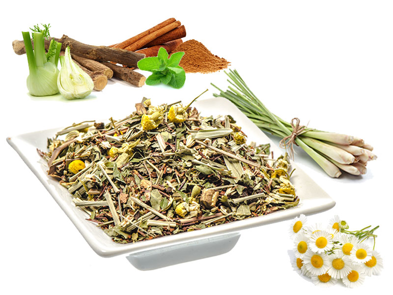 Rooibush, schwarze Johannisbeerblätter, Zitronengras, Pfefferminze, Anis, Süßholzwurzel, Ceylon-Zimtstücke. Verpackung: 100g.